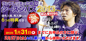 ただいまサンフレッチェ広島では、年間を通じて熱く応援いただく方にオススメの「2013シーズンパス」の申込受付中です。