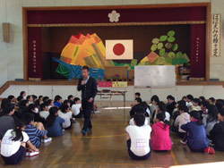 6時間目は藤本主税選手が登場し、子どもたちに「夢と目標」について語りました。藤本選手はこれまでの自分の人生を、夢曲線を描きながら語り、夢と目標を分かりやすく説明してくれました。