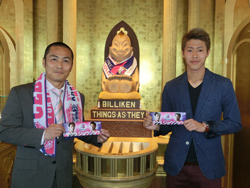 昨日(3月14日)、柿谷選手と森島寛晃アンバサダーが「ビリケンさん」(通天閣)に必勝祈願した際、「桜前線上昇ステッカー」を持って記念撮影しました。