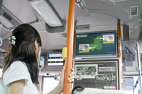 岐阜バス車内にて、運転席後ろ部分のポールの間に、22インチの液晶表示器を搭載しています。現在、連節バスをはじめとして、計100台の表示器を設置し、ニュースやイベント情報、企業広告などを15分から20分のサイクルで放映し、乗客の皆様に様々な情報を提供しています。