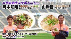 サンフレッチェ広島では、4月6日(土)J1リーグ第5節vs.横浜F・マリノス@エディオンスタジアム広島14:00キックオフより販売開始する、4月の「選手コラボメニュー」として、岡本 知剛選手「焼き鳥丼(タレ&塩だれ)」と山岸 智選手「豚の生姜焼き丼」を販売しますので、お知らせいたします。