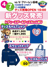 このたび、4月7日(日)vs V・ファーレン長崎より、新グッズ「ティスちゃんTシャツ」、「スウェットトップ」、「シースルーバック」をホームゲーム会場グッズ売り場にて販売いたします。