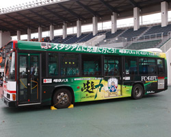 『この度、地元のチームを応援するために当社としてできることを考えた結果、路線バスのラッピングをさせていただき、地元の応援を盛り上げることだと思いました。ぜひ、スタジアムへお越しの際もバスをご利用いただければと思います』