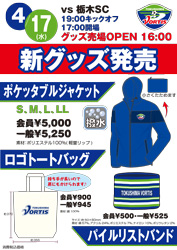4月17日(水)栃木SC戦より、新グッズ「ポケッタブルジャケット」、「ロゴトートバッグ」、「パイルリストバンド」をホームゲーム会場グッズ売り場にて販売します。