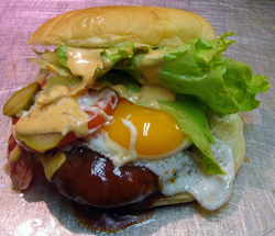 ジャンボバンズ・牛肉100%パテ・ベーコン・目玉焼き・チェダーチーズ・レタス・トマト・タマネギ・スペシャルソース