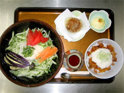 ぶっかけおろしうどん、豚キムチとろろ丼、揚げ饅頭、アイス