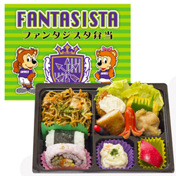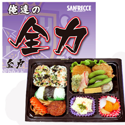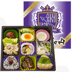 内容:サンフレッチェロールSushi、俵むすび、焼きそば、豚カツ、鶏のからあげ、出し巻きたまご、タコさんウィンナー、白身魚のフライ、レタス、ポテトサラダ、りんご