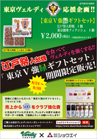 この度、東京ヴェルディと、東京ヴェルディのコーポレートパートナーである株式会社ショウエイ(本社:東京都足立区、代表取締役 森 統則)のコラボレーション企画として、1セットご購入いただく毎に売上の500円がクラブ強化費に充当される「東京V強緑ギフトセット」を期間限定で販売いたします。