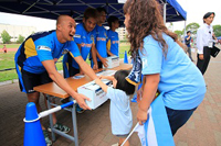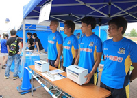 バックスタンド場外「カマタマーレ讃岐グッズ売場」横付近にてカマタマーレ讃岐の選手が募金箱を持ち、募金活動を行います。