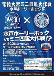 10月26日(日)カマタマーレ讃岐戦におきまして常陸大宮ミニ四駆大作戦様のご協力をいただき、ミニ四駆によるトーナメント方式の大会『水戸ホーリーホック杯withミニ四駆大作戦』をケーズデンキスタジアム水戸イベント広場にて開催いたしますので、下記の通りお知らせいたします。