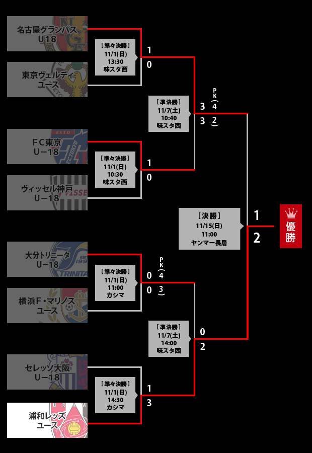 TOP ニュース 日程・結果 トーナメント表 得点順位表 選手紹介 アクセス 歴史と記録 大会概要 Tweet ニュース&更新情報 2015/11/15(日) NEW!! ニュース 【サマリー:決勝】粘る名古屋U18を振り切り 浦和ユースが悲願の初優勝! 15日、ヤンマースタジアム長居でJユースカップ決勝が行われ、浦和レッズユースが名古屋グランパスU18を下し、大会初優勝を果たした。 2015/11/15(日) NEW!! ニュース 【決勝】浦和ユース優勝における村井 満チェアマンコメント 2015/11/13(金) コラム Jユース頂上決戦 最後に笑うのは名古屋か、それとも浦和か TOPICS準決勝進出チーム(名古屋、FC東京、大分、浦和)選手紹介ページ 準々決勝 試合動画 名古屋グランパスU18 vs 東京ヴェルディユース FC東京U-18 vs ヴィッセル神戸U-18 大分トリニータU-18 vs 横浜F・マリノスユース セレッソ大阪U-18 vs 浦和レッズユース トーナメント表 (準々決勝〜決勝) ページの先頭へ戻る Tweet