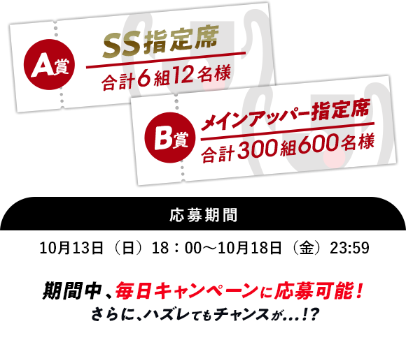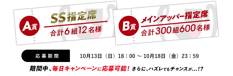 | 実施期間 | 10月13日(日)18:00~ 10月18日(金)23:59 ※応募期間中、お一人様につき、1日1回限りで、何度でもご応募いただけますが、当選は、応募期間中、お一人様につき1回までとなります。 |