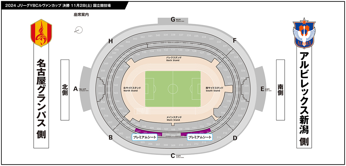 ※Premier Seat北をご購入の場合は名古屋グランパス、Premier Seat南をご購入の場合はアルビレックス新潟の選手数名のサイン入り限定Tシャツをプレゼントいたします。選手指定はできませんので予めご了承ください