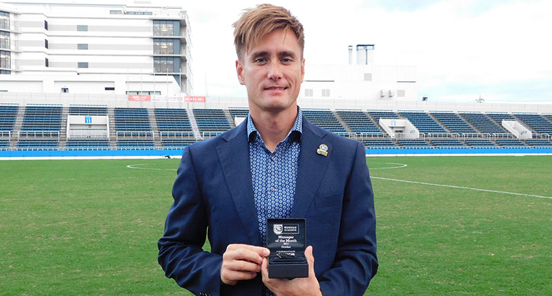 - この度は2021明治安田生命J3リーグ10月の月間優秀監督賞に選んでいただきありがとうございます。数多くの名将の中から最年少の私が選ばれたことに正直とても驚いております。聞くところによるとこの賞はその月で1番強かったチームの監督に与えられる賞だと伺いました。これはまさに10月を無敗で戦い抜いてくれた私の選手、スタッフ、そして我々を日々支えてくれている仲間たちが Oneteam で勝ち取った賞です。この場を借りて彼らに心より感謝、そして最大の敬意を示したいと思います。残りの4ゲームもJリーグを盛り上げていけるよう仲間たちと頑張ります。ありがとうございました。
