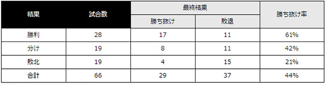 結論から言えば、第2戦をホームで戦ったチームのほうが勝ち抜け率がわずかに高かった。グループリーグ上位チームが第2戦をホームで戦うケースが多く、同点の場合は延長戦をそのままホームで戦えることも勝利率を高くしている要因のひとつと考えられるが、いずれにせよ、第2戦をホームで戦えるほうが優位な結果が示されている。