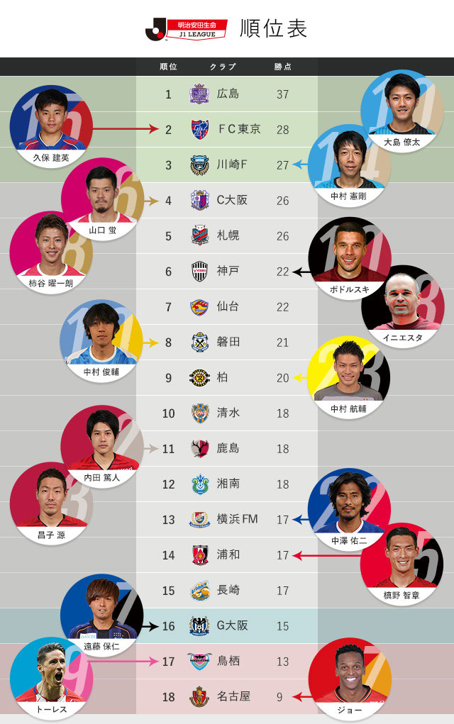 一方で、過去にリーグ優勝の経験を持つ鹿島、横浜FM、浦和、G大阪、名古屋といった名門チームが揃って苦境に立つ、これまでにない展開も今季の特徴です。特に降格圏に沈むG大阪(16位)と名古屋(18位)はここからの巻き返しが必須な状況です。このほか、イニエスタ加入で注目を集める神戸は現在6位と好位置につける一方で、トーレスが加入した鳥栖は降格圏の17位と苦しい状況。ですが、群雄割拠がJ1の特徴でもあるだけに、どこがトップに立つかは最後まで目が離せません。