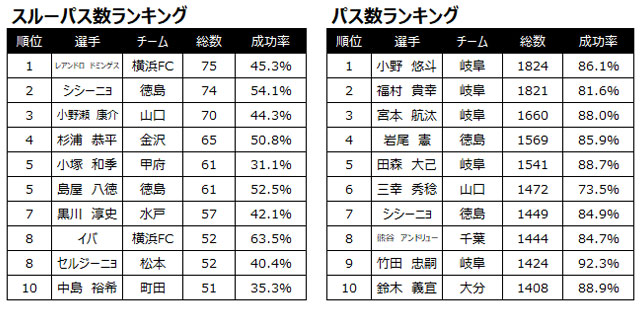 『パス数ランキング』では岐阜勢がトップ3を独占。トップ10のうち5人が岐阜の選手で占められており、ポゼッションスタイルを標榜するこのチームの特徴がデータからもはっきりと浮かび上がっている。