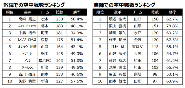 『敵陣での空中戦数ランキング』では、強靭なフィジカルを備えた外国籍選手を抑えて、松本の高崎 寛之がトップに立った。空中戦の機会が多いのはチームのスタイルにも左右されるものだが、特筆すべきはその勝率。60%近い数値を叩き出しており、その高さは松本の大きな武器となっている。