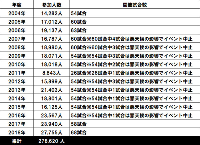 68試合(15年間累計827試合/うち20試合は悪天候の影響でイベント中止)