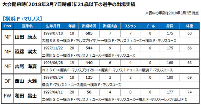 チーム全体で比較しても、21歳以下の選手の出場割合は、「出場試合」、「出場時間」、「スタメン起用」のいずれの項目でも湘南が横浜FMを上回る結果となった。また「ゴール数」も3で、ひとつもなかった横浜FMを上回った。