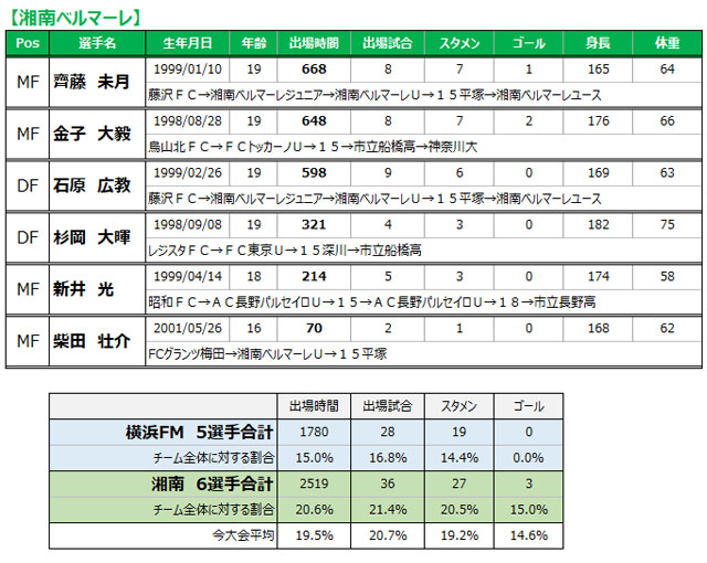 準決勝まで計12試合を戦った湘南は、6人の選手が出場している。試合数が最も多かったのは、9試合の石原 広教。齊藤 未月と金子 大毅が8試合で続き、新井 光(5試合)、杉岡 大暉(4試合)、柴田 壮介(2試合)の順となっている。出場時間では8試合中7試合にスタメン出場した齊藤が668分でトップとなった。特筆すべきはユース所属の柴田で、16歳ながら(現在は17歳)スタメン1試合を含む、2試合に出場を果たしている。
