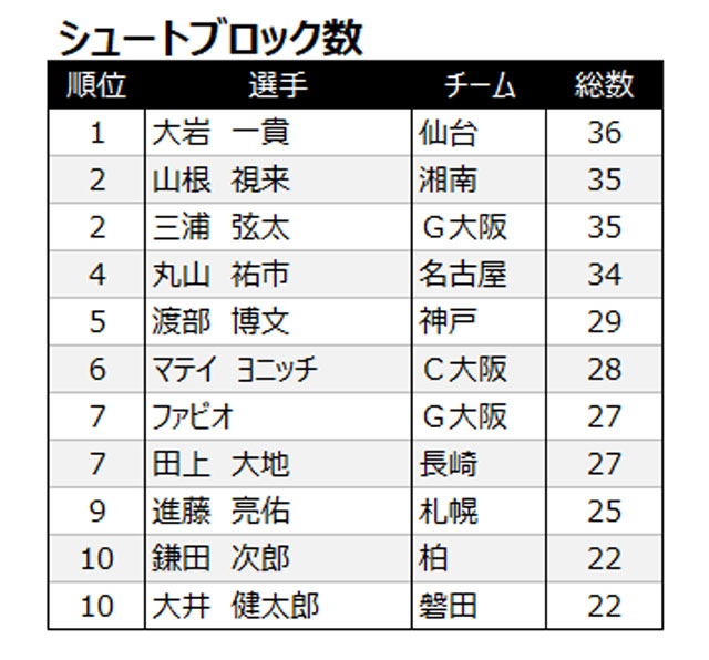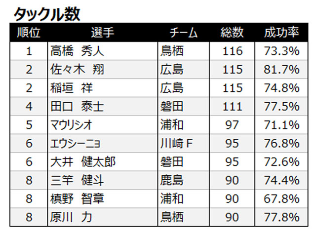 「シュートブロック数」は仙台の大岩 一貴がトップに。「タックル数」は鳥栖の高橋 秀人が1位となった。また成功率では日本代表にも定着した広島の佐々木 翔が80%超を記録している。