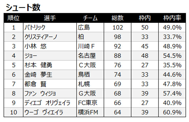 「シュート数」では広島のパトリックが唯一、100本超を記録。このパトリックをはじめ、得点ランクの上位陣と顔ぶれはさほど変わらないが、クリスティアーノ(柏)、杉本 健勇(C大阪)、金崎 夢生(鳥栖)らは、そのシュート意識の高さを得点に結びつけることができなかった。