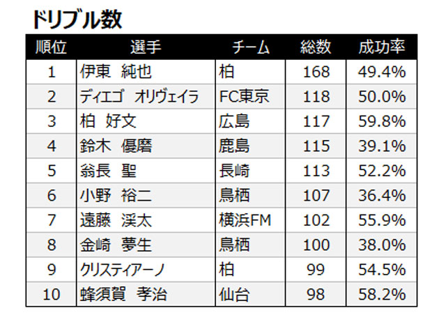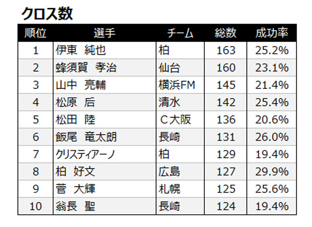 「ドリブル数」は柏の伊東がダントツでトップ。3位の柏 好文(広島)は、60%近い成功率を誇っており、その精度の高さが際立った。「クロス数」でも伊東がトップに。成功率も高く、鋭いドリブルからの正確なクロスで得点機を生み出した。