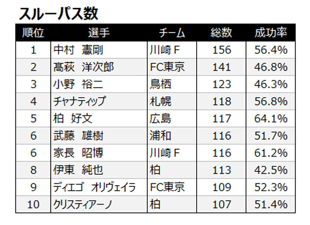 「スルーパス数」では中村 憲剛(川崎F)が貫録の1位に。意外だったのは広島の柏で、ドリブル成功率だけでなく、スルーパスの成功率でも好数値を記録し、攻撃センスの高さを示した。