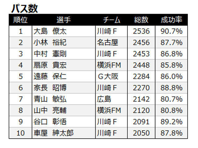 「パス数」では川崎F勢が10傑のうち5人を占める結果に。総数トップの大島 僚太は成功率でも90%超を果たし、正確無比なパスワークで川崎Fの攻撃を操った。