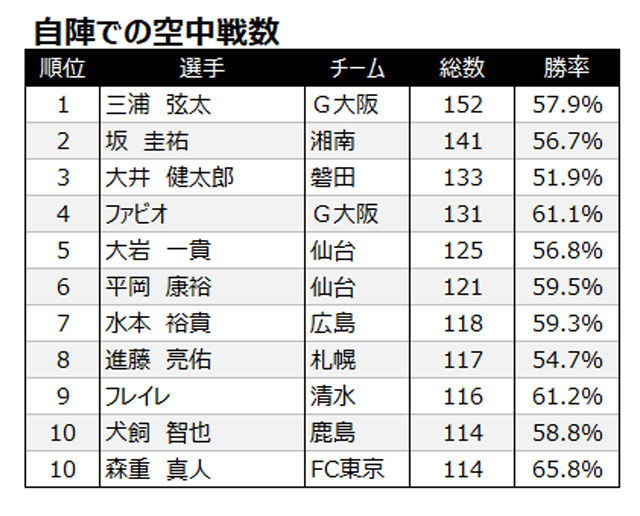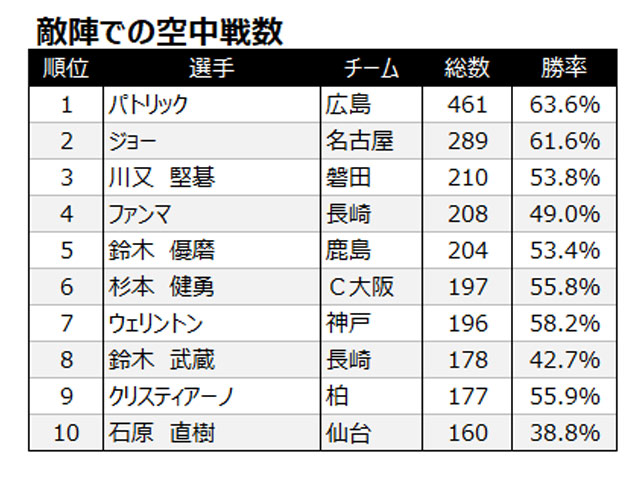 「敵陣での空中戦数」はパトリックがダントツの数値を記録。勝率も高く、その高さを生かして広島の攻撃の起点を担った。一方、「自陣での空中戦数」はG大阪の三浦 弦太がトップに。湘南の残留に貢献した大卒ルーキーの坂 圭祐は、174センチとCBとしては小柄ながら、身体能力の高さを生かし、空中戦でも強さを発揮した。