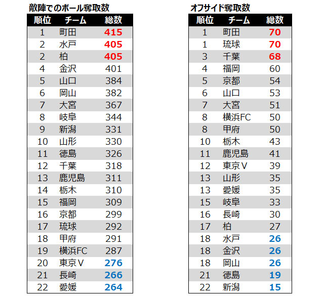 16位とよもやの低迷を強いられている町田だが、データ上では決して悪い数値を示しているわけではない。敵陣PA内プレー数はトップで、敵陣でのボール奪取数も最多。オフサイド奪取数も1位タイとなっている。高い位置でボールを奪い、エリア内に侵入する回数も多いものの、その積極性が得点に結びつかず、リスクを負う分、失点が増えている現状が浮かび上がっている。
