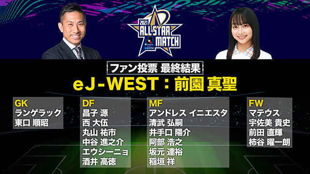 また、1月23日(土)にエキシビジョンマッチとして実施される『eJリーグ ひかりTV オールスターマッチ』のファン投票の最終結果を発表いたします。当日はeJ-EAST:影山 優佳さん、eJ-WEST:前園 真聖さんがゲストプレイヤーとして、オールスターチームを操作して勝敗を競います。