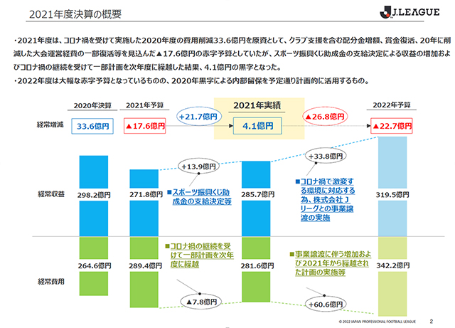 先ほど申し上げた21年と22年、いわゆるサバイバルモードでの赤字を想定した予算組みに関して、21年は当初17億の赤字を想定していたものの、一部、独立行政法人日本スポーツ振興センター様のスポーツ振興くじからの助成金支給、またコロナ禍の継続を受けて一部計画を見直し、次年度に繰り越した経費等があります。そのような影響に伴い、21年は結果的に4.1億円の黒字を計上することができました。