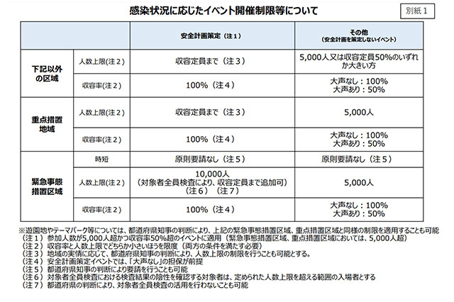 上記が政府の事務連絡で通知されている内容です。図で示されている右側の列の「その他」というのは、2022年より前からもともと政府方針にあった内容です。Jリーグも2021年まではずっと右側だけで運用してきました。