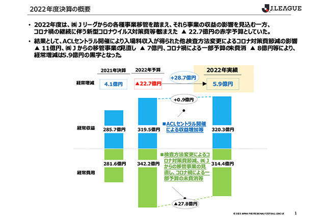要因としまして、収益についてはほぼ予算通りに収まっているのですが、中身は様々な増減がございます。この後ご説明いたします株式会社Jリーグからの移管事業の見直しにおいて、一部費用および収益が減少しているというところが約7億円ありました。しかし一方でAFCチャンピオンズリーグ(ACL)をセントラル開催による入場料収入等の増加の影響等で、収益については最終的にはほぼ予算通りの着地となっています。