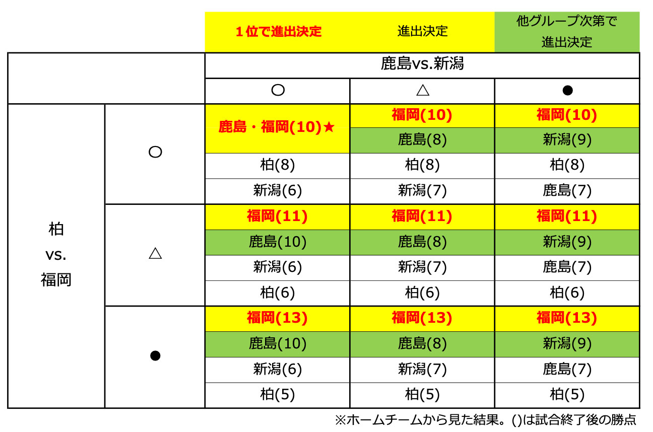 ★鹿島と福岡は直接対決の結果が同率のため、グループ全体の得失点差・総得点で順位が決定。それでも決定に至らない場合は、反則ポイントの少ない順、抽選で決定する。