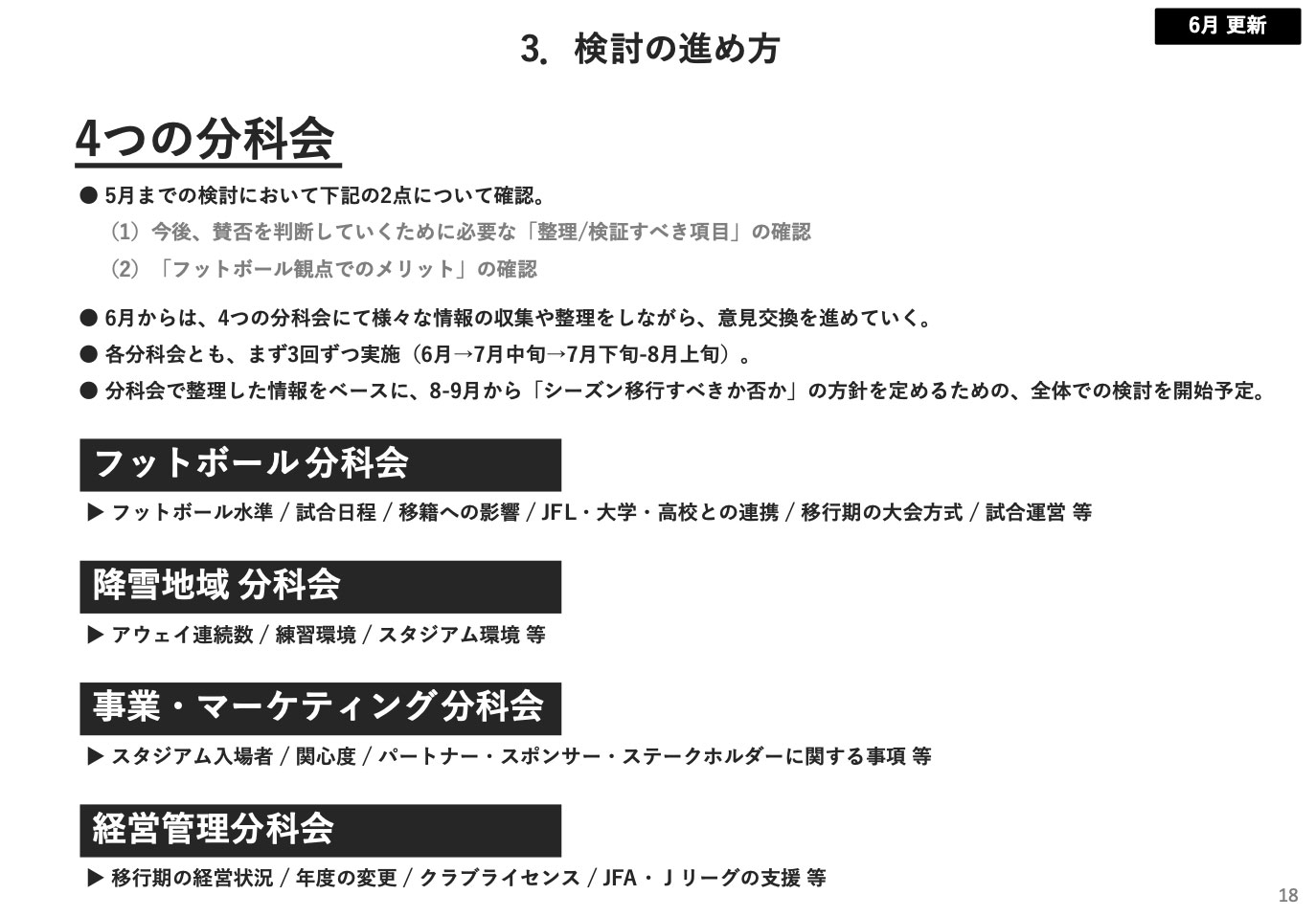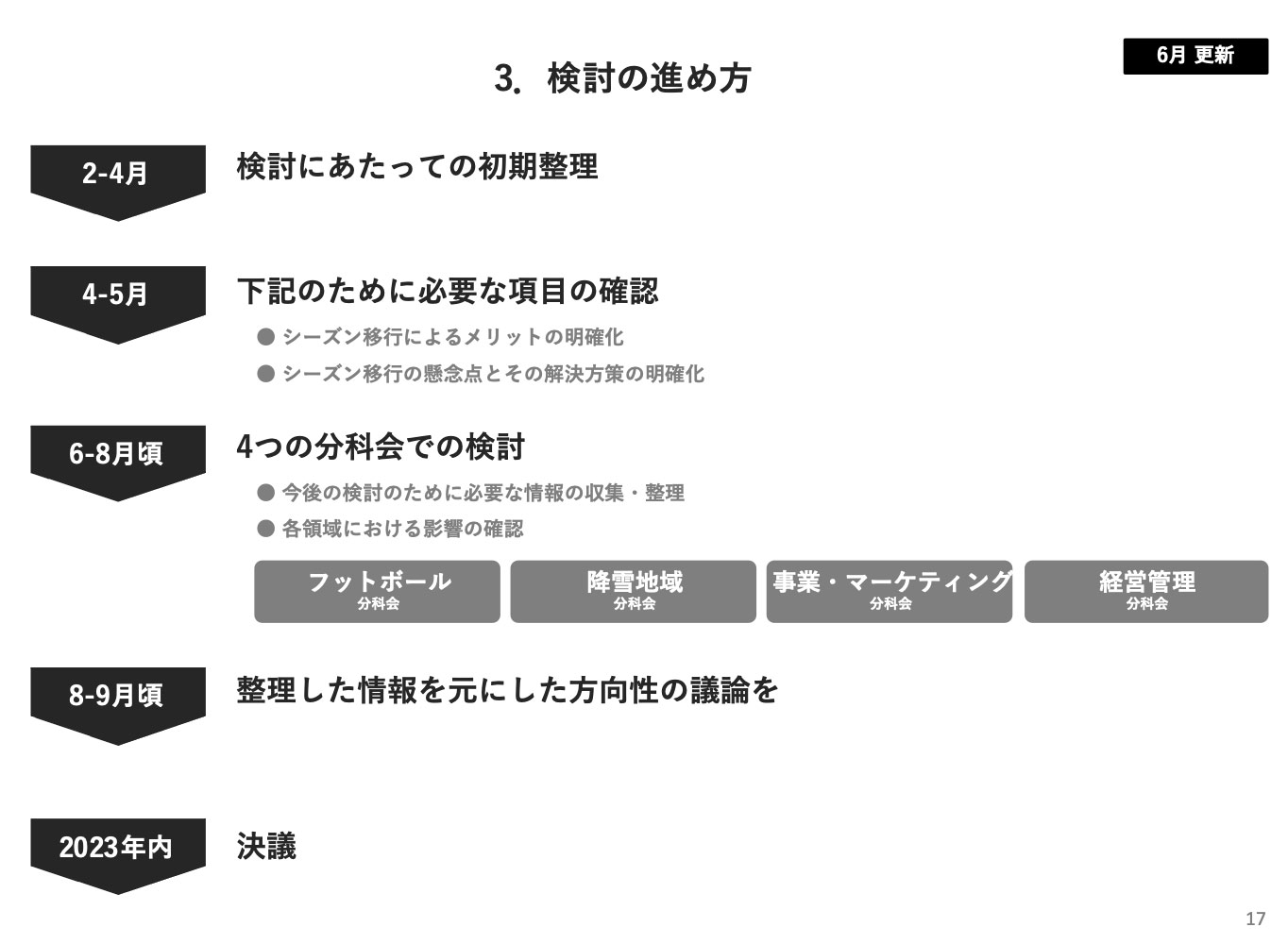 前提として、5月までの検討で、まず、シーズン移行は「フットボール観点でメリットがある」ということが確認されていますので、フットボール観点でのメリットを目指してもし移行するのであればどういう懸念があるのか、フットボール以外での良い点、悪い点、両方のカレンダーを精査していこうという分科会になります。各会ともまず3回ずつの実施を想定していまして、6月に1回目、7月中旬ぐらいに2回目、7月下旬から8月上旬頃に3回目を実施し、最終的には分科会で得た情報を統合したものをもとに、8月の実行委員会・理事会あたりから「シーズン移行するべきか、するべきでないか」という賛否を問う議論を開始したいと思っています。