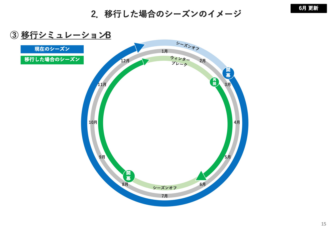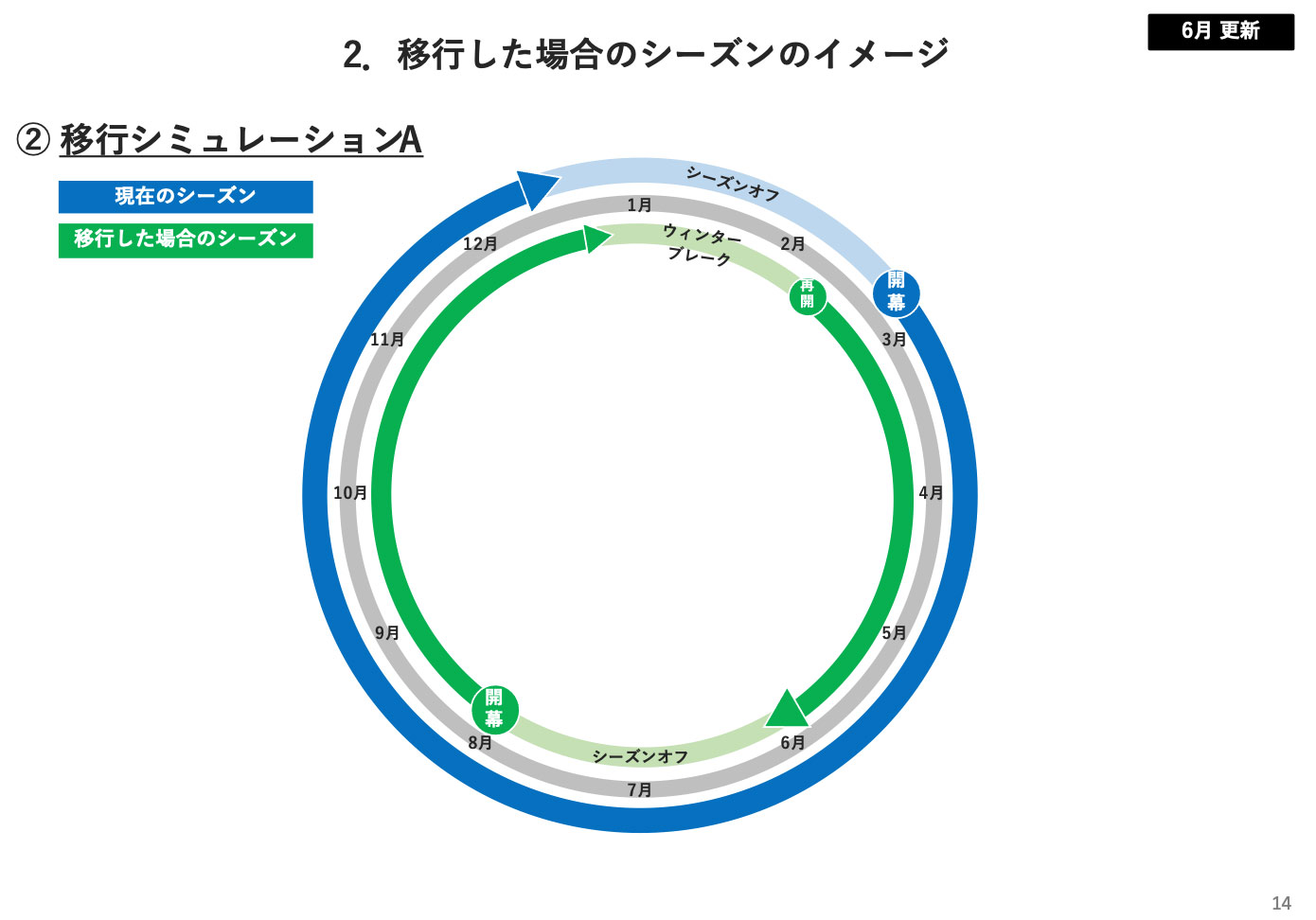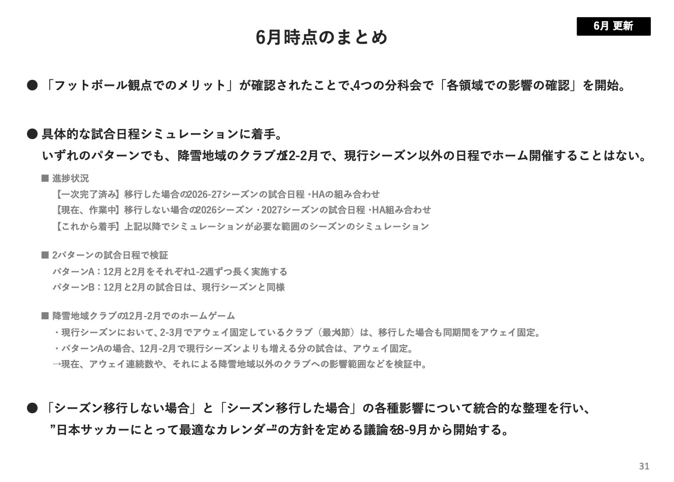 6月の検討においては大きく2点です。先週のキリンチャレンジカップの時にも少しご説明しましたが、実行委員会での全体的な議論から4つの分科会に議論を移していくことが1点。もう1点が試合日程をより具体的に精査してシミュレーションを進めることです。試合日程のシミュレーションについて、今までご説明してきたシーズン移行した場合のカレンダーにおいては、現在のシーズンよりも12月と2月はそれぞれ1-2週ずつ長く実施するものでしたが、今回新しい案として、12月と2月は現在のシーズンと同様の期間にしか試合をせずにウィンターブレイクを長く取るという案も準備し、大きく2案でシミュレーションを進めています。