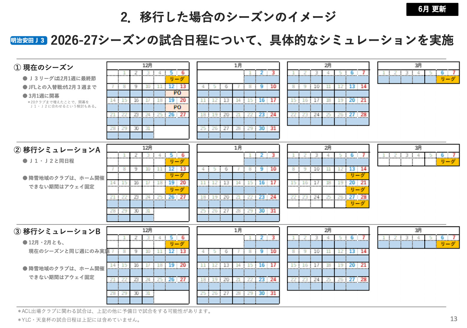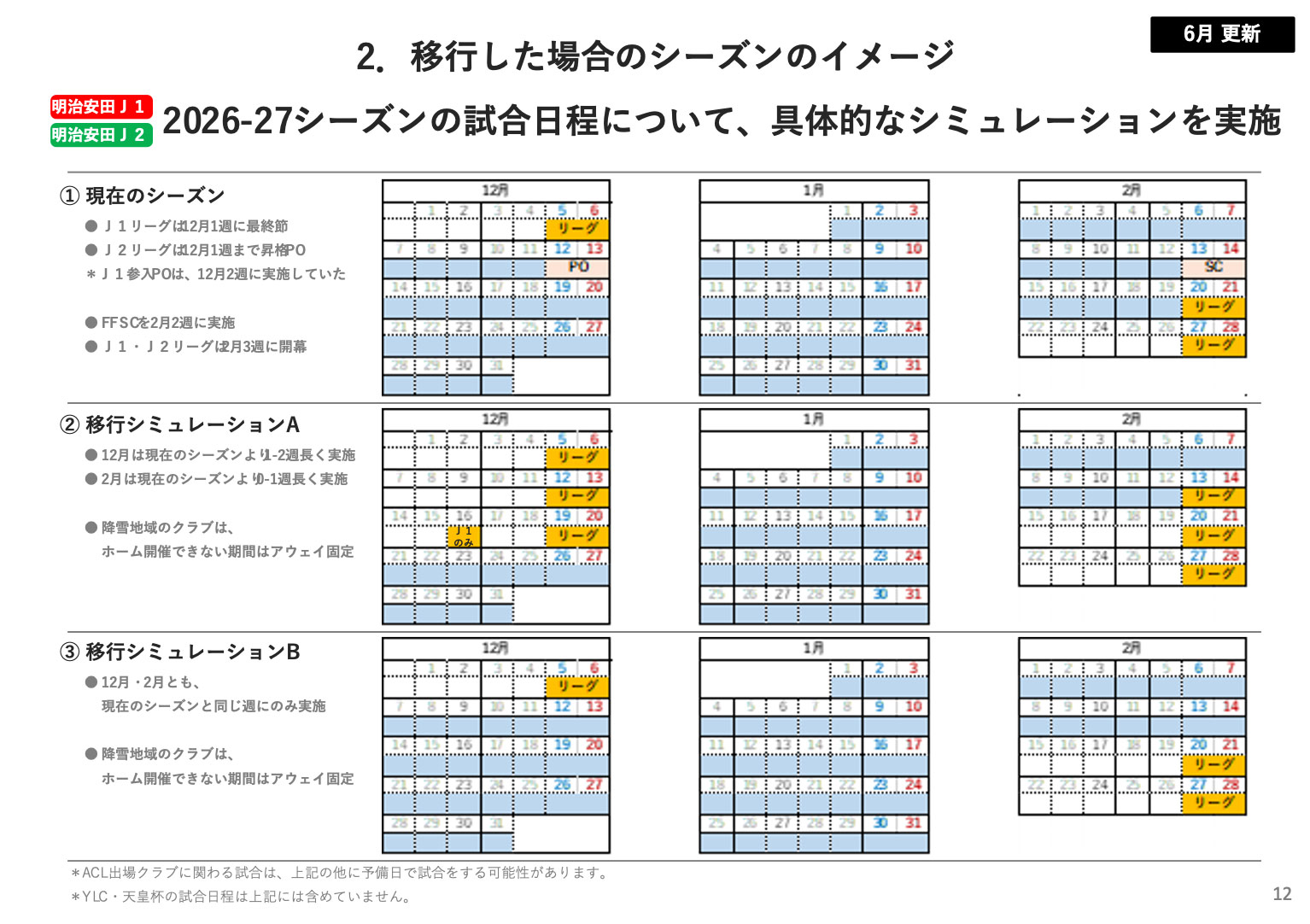 シミュレーションとして一次完了をしているものが26-27シーズンの具体的な試合日程とホーム、アウェイの組み合わせです。移行しない場合の2026シーズンと2027シーズンのシミュレーションを現在作業しています。これからは、2026と2027だけではなく、その先も「ワールドカップがある年」「クラブワールドカップがある年」などいろいろありますので、どの範囲まで精査すべきなのかも考えながらシミュレーションを進めていきたいと思っています。