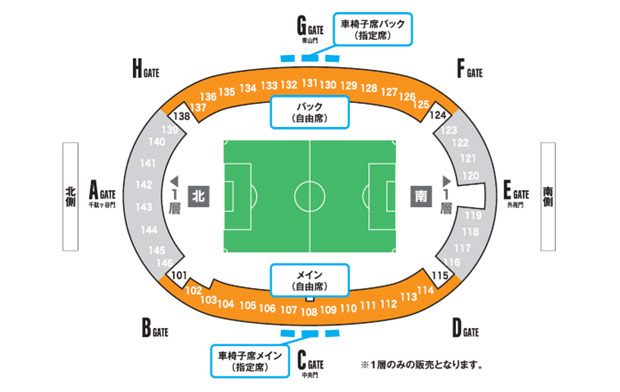 ※前方のお席はフォトグラファー、広告看板、テレビカメラ等があるため、タッチライン際が見えないことがあります。またピッチサイドに人が立つ可能性があります。なお、見えない範囲は座席位置によって異なります。予めご了承下さい。