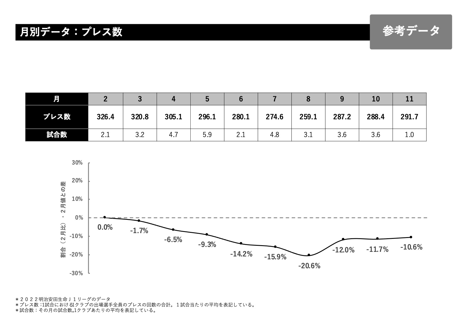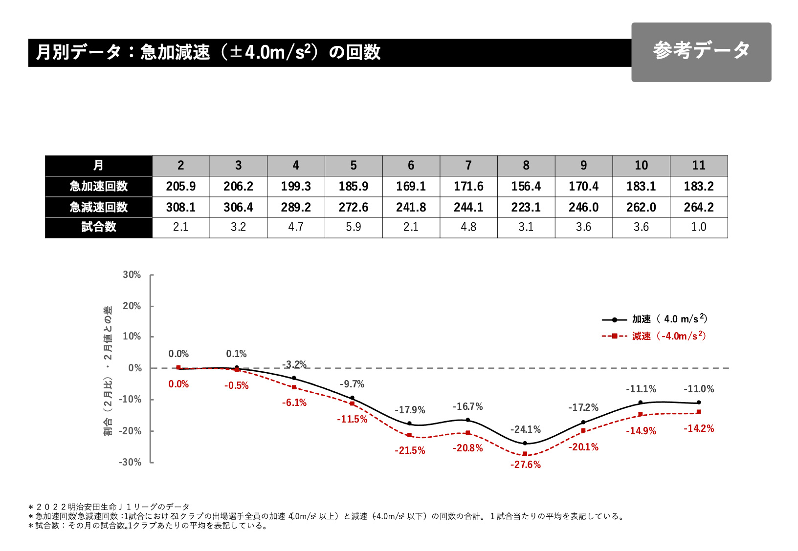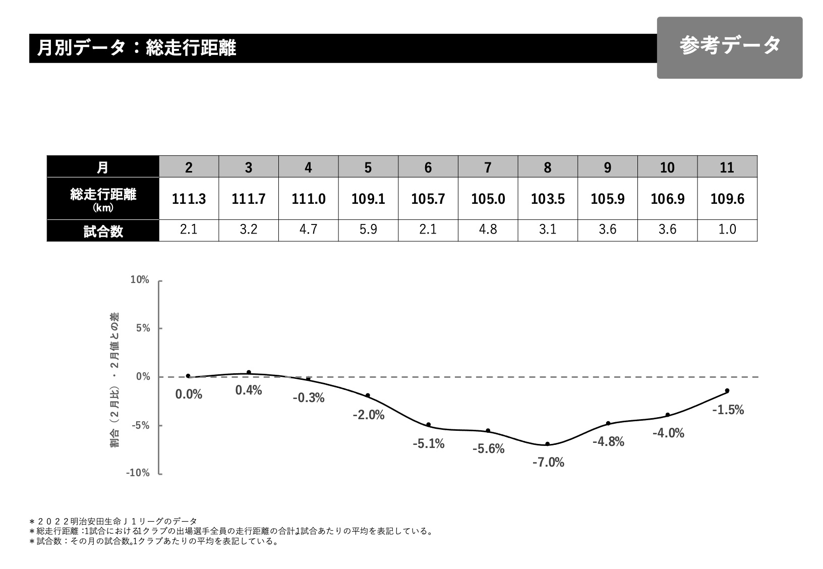 総走行距離で言いますと大体1試合、1クラブあたり111キロが2月の平均になるのですが、これを0とした時に増えているのか減っているのか割合を月別に示しているのが下のグラフになっています。総走行距離で言いますと、6月くらいから少し下がってきて6、7、8、9と10月あたりも少し下がり11月に向けて少し上っていくデータになっています。
