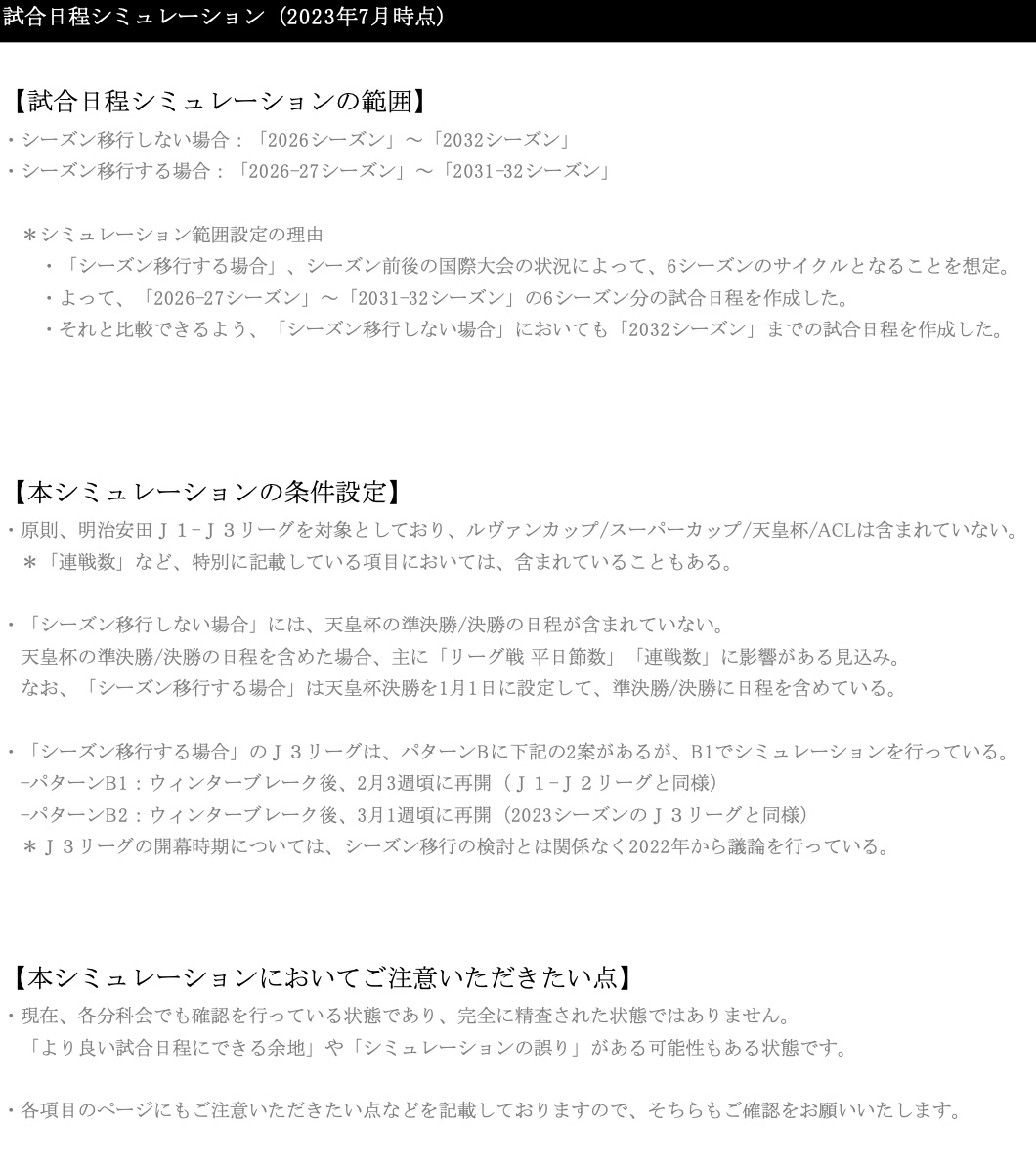 なぜここまでやっているかというと、移行する場合の最速は2026―27に設定しているので、2026―27シーズンから開始にしています。移行した場合、6月-7月ぐらいに国際大会でシーズンの前後を挟まれることになります。例えば前にワールドカップがあって、後ろにアジアカップがあるとか、前にワールドカップがあって、後ろに何もない、前にクラブワールドカップがあって、後ろにワールドカップあるなど、挟まれる状況が6種類あり、6年分で1サイクルになっています。従って、6年間によって、始まる週が少し変わったり、終わる週が少し変わったりしますので、これらの影響をしっかりと検証するために、1サイクル、6シーズン分のシミュレーションを行っています。それに合わせて、シーズン移行しない場合についても、同様に2026シーズンから2032シーズンまでをシミュレーションしているという状況です。