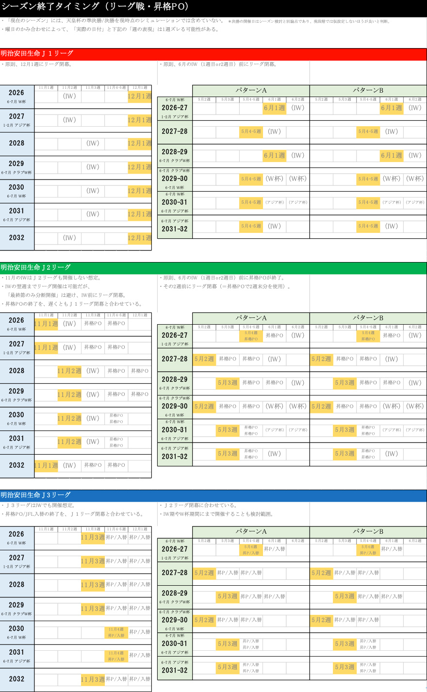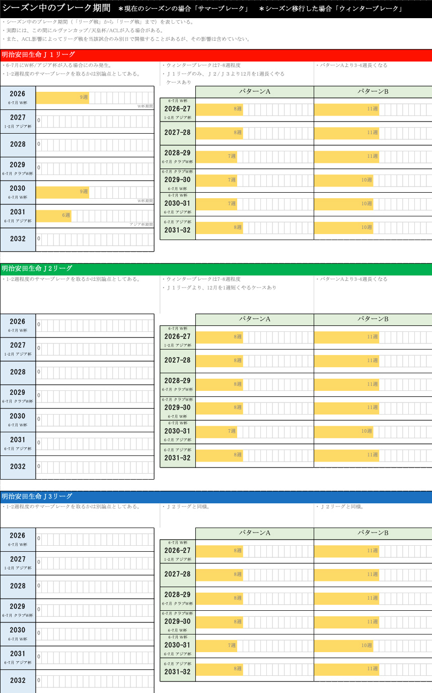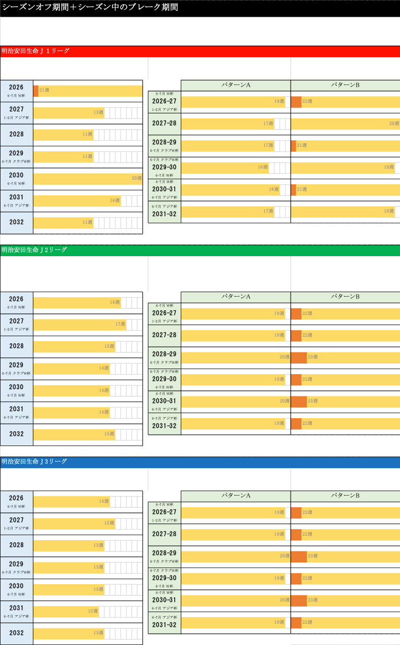 J1、J2、J3と上から並べていまして、左側のブルーがシーズン移行しない場合の2026シーズンから2032シーズンまで。緑の方が2026―27シーズンから2031―32シーズンまでのパターンA(ウィンターブレークが短いもの)、パターンB(ウィンターブレークが長いもの)のそれぞれのカレンダーを示しています。例えばシーズン開始のタイミングでいいますと、シーズン移行しない場合は基本的には2月の3週ぐらい、その1週間前にFUJIFILMSUPERCUPを実施しているという状況になっています。これが移行すると、大体8月の1週目もしくは2週目ぐらいにリーグ戦が開幕することを示しています。以下、J1,J2、J3とそれぞれ別で記載をしている状態です。