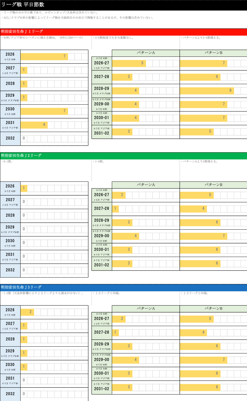 こちらはリーグ戦の平日の節数です。こちらの注目度は高いと思います。ルヴァンカップ、天皇杯は含めていません。リーグ戦のみの平日です。J1におきましてはこちらも8年に3回のサイクルで平日の節数は増える状態になります。全38節のうちのワールドカップイヤーは7節ぐらいが平日になるのではないかという見込みです。これが移行しますと3-5節ぐらいでどの年も大きな変動がない状況になります。例えば2027シーズンと、2027―28シーズンを比較しますと、2節分、平日が増えることになります。1クラブのホームゲームでは半分になりますので、ホームゲームとしては1試合平日が増えるというイメージです。パターンBになりますと、ウィンターブレークを長く取る分、12月と2月でそれぞれ少し長くやろうとしていた分がほかのところの平日に入ってきます。その分、平日の節数が少し増えるというイメージとなっています。J2、J3につきましては、ワールドカップ期間中、アジアカップ期間中もリーグ戦を行う前提ですので、基本的には移行しない場合は平日開催がない、もしくは1、2節程度となっているものが、移行すると、1~4節程度に増えるというイメージになっています。