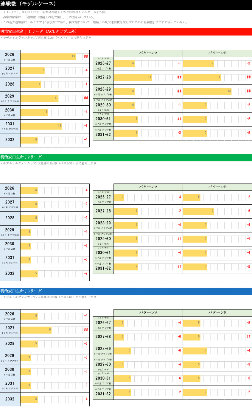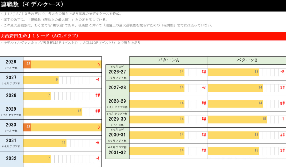 モデルケースでいきますと、J1は例えばルヴァンカップと天皇杯がベスト8まで勝ちあがった場合は連戦がどうなるのか。赤い数字は先ほど申し上げた最大の連戦数とどういう差異があるのかを示しています。