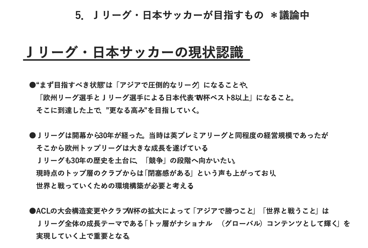 このような現状認識の中、今、Jリーグとしてどのような戦略で何を目指していくのかといった整理を進めているところです。こちらもまだ議論中で、固まっていないものなのですが、ぜひメディアの皆さまから多くのご意見をいただきたいと思い、公開させていただきます。