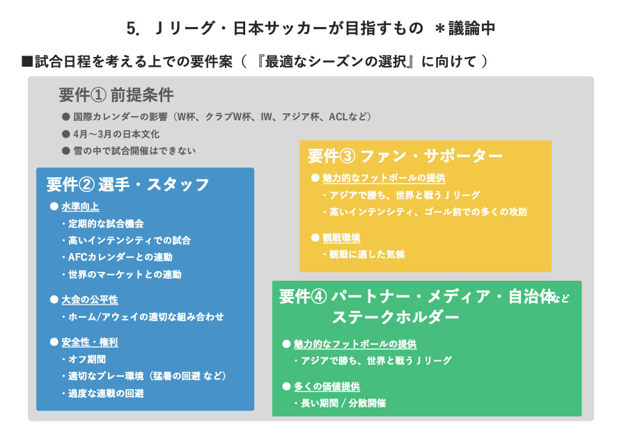 3つ目がファン・サポーターにどのように魅力的なフットボールを提供するのか、また観戦環境、観戦に適した気候でどの程度サッカーができるのか。4つ目がパートナー・メディア・自治体などのステークホルダーに向けても、魅力的なフットボールの提供、また、できるだけ多くの価値を提供するにはどのような試合日程がいいのか。こういった要件を整理しながら、最終的には目指すものが何かということも含め、統合的な議論を今後続けたいと思っています。