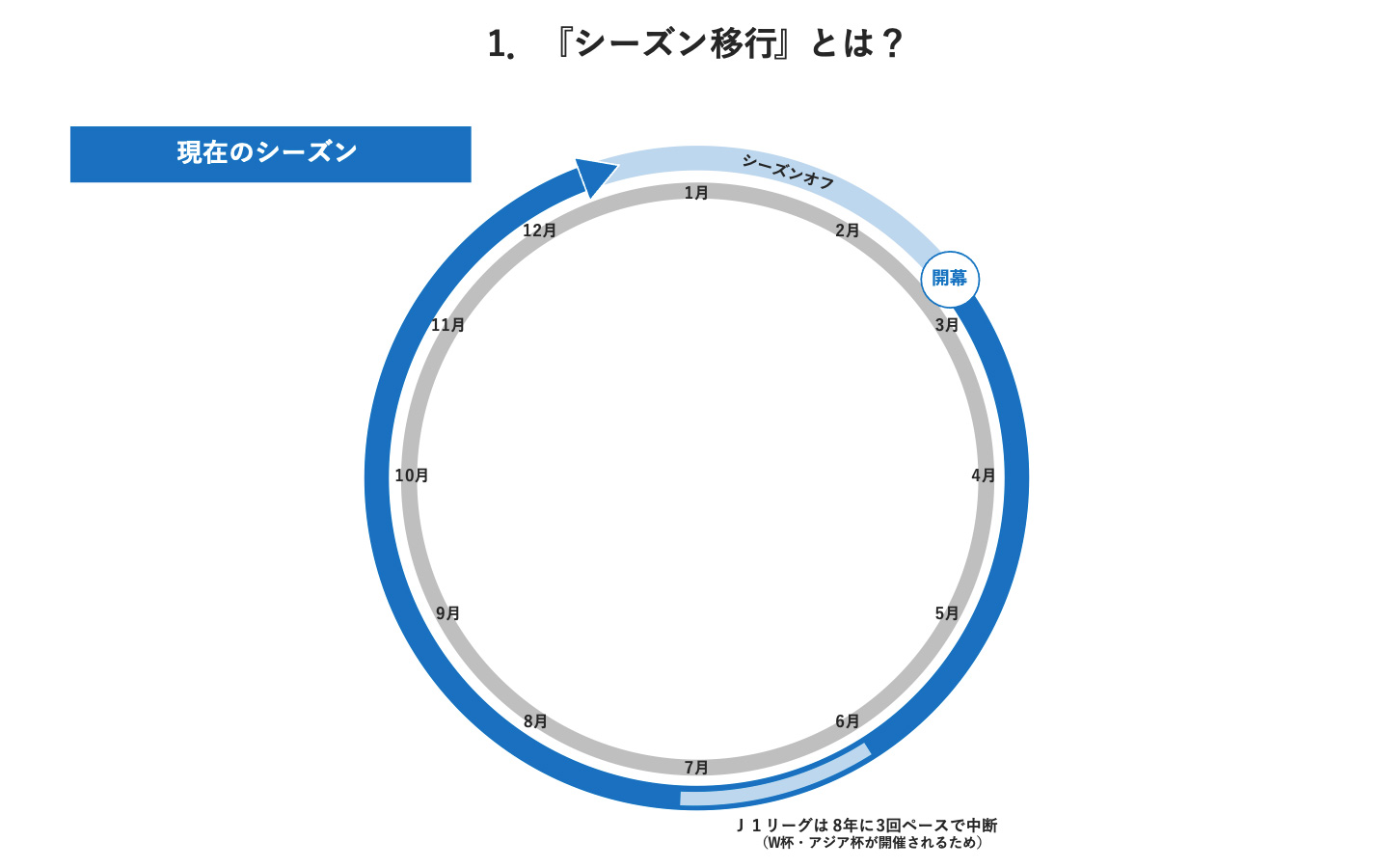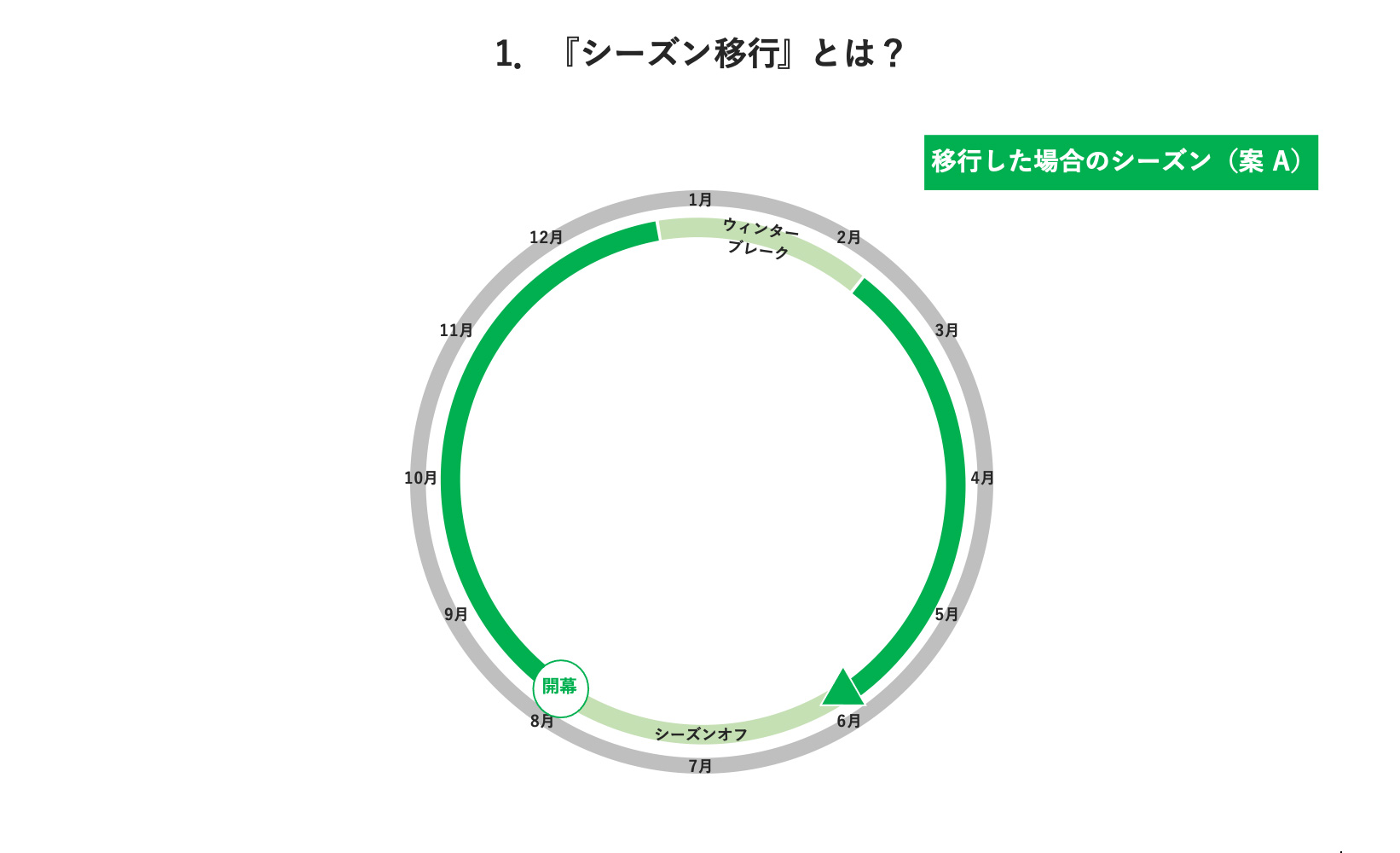 まず、シーズン移行とは何か、です。資料中のグレーの円が1月から12月を表しており、現行のシーズンは、2月後半頃に開幕をして12月の初旬頃に終わるというシーズンになっています。