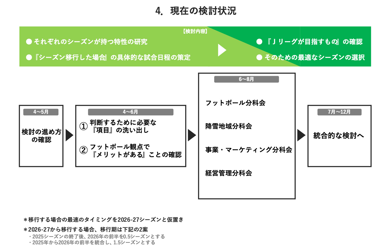 冒頭にお伝えしましたとおり、今までずっと研究を進めています。分科会の3回目を終えるところぐらいで様々な研究も概ね進んでいく見込みが立っていますので、いよいよ「Jリーグとして何を目指していくのか」「そのためにどのような試合日程、カレンダーが必要なのか」という議論に移行していくタイミングになっており、7月の実行委員会、理事会から頭出しをさせていただいています。